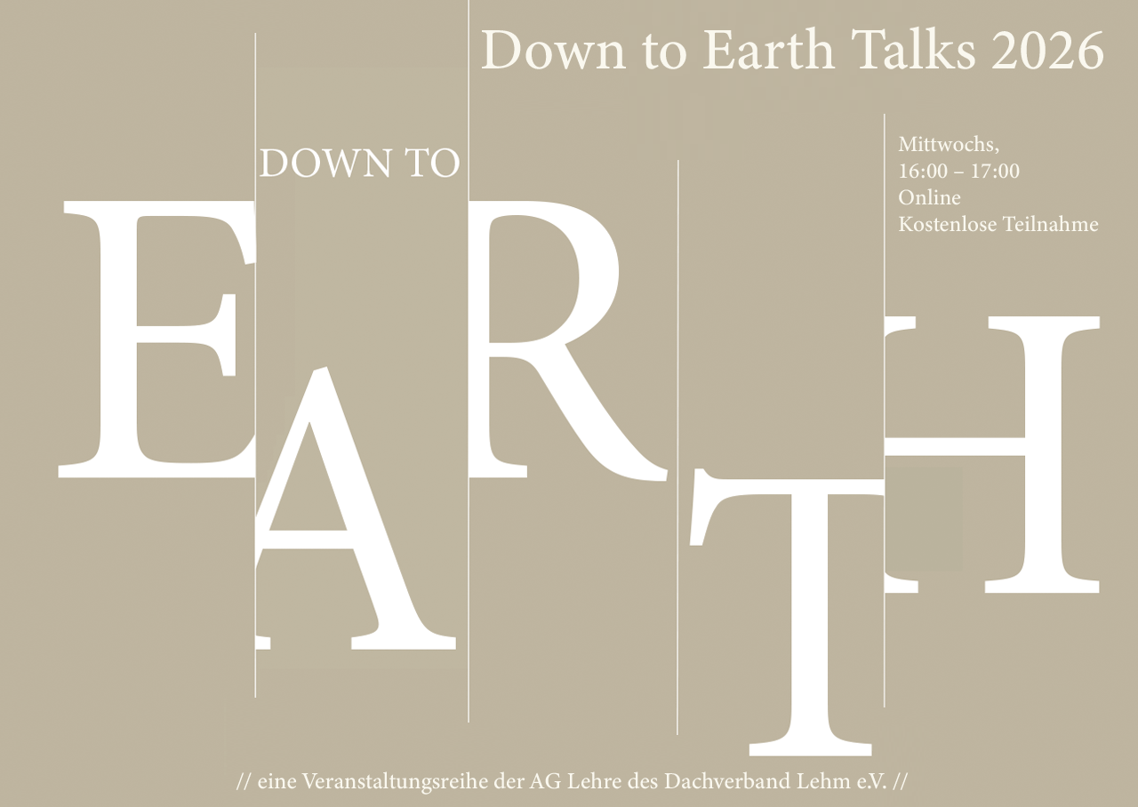 Die Down to Earth Talks sind eine Veranstaltungsreihe der AG Lehre des Dachverband Lehm e.V. und richten sich an Studierende, Fachplanende, Menschen aus der Praxis und alle am Baustoff Lehm interessierte Personen.