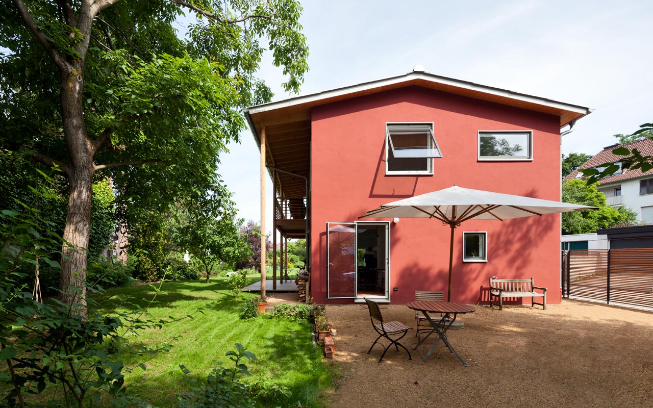 Das kleine Einfamilienhaus steht auf einem innenstadtnahen Gartengrundstück. Das begrenzte Budget erforderte eine einfache Konstruktion mit ökologischen Baustoffen und flexibel nutzbare Räume in hoher architektonischer Qualität. Ein gutes Raumklima war gewünscht sowie ein angemessener Wärme- und Schallschutz. Der Bau wurde in sechs Monaten unter Einhaltung der Baukosten errichtet.